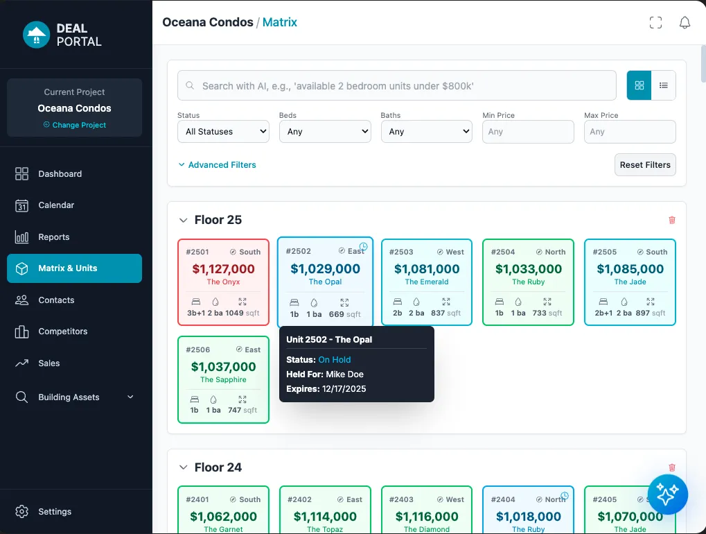 - When a unit is sold, reserved, repriced, or updated, the change is instantly reflected across the platform.